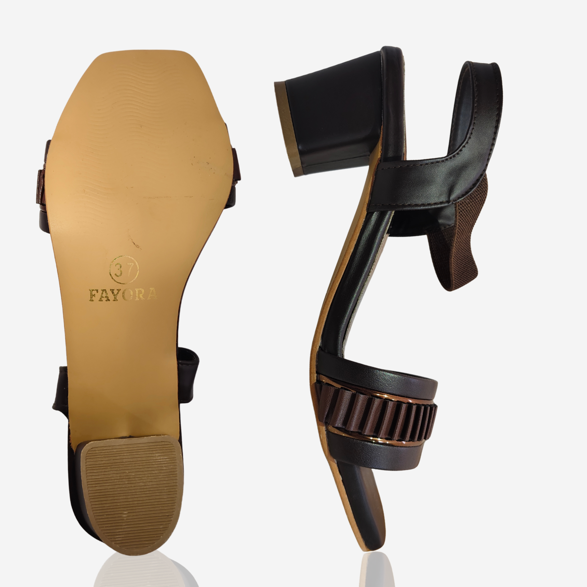 FAYORA presents stylish and comfortable brown block heel sandals featuring a soft cushioned footbed, textured front band, and flexible elastic ankle strap—perfect for office, casual, and party wear.